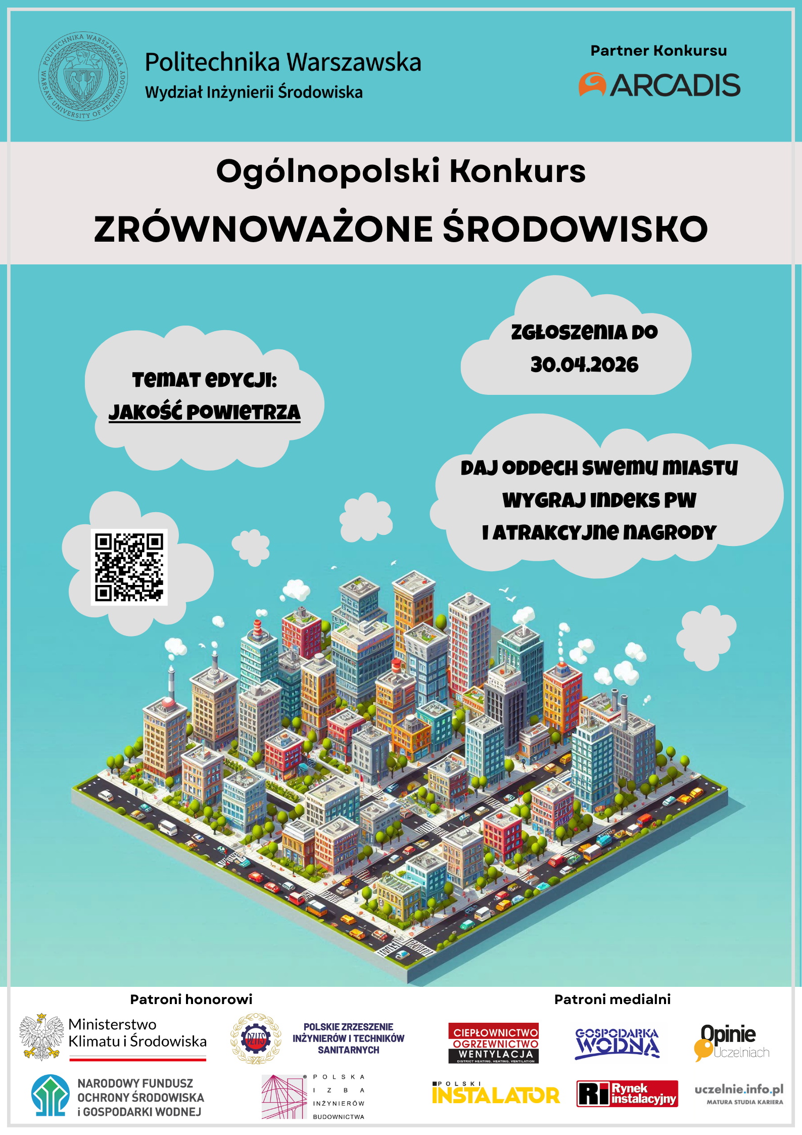 Zapraszamy uczniów szkół średnich i techników do udziału w Konkursie o Indeks „Zrównoważone Środowisko organizowanym przez Wydział Inżynierii Środowiska Politechniki Warszawskiej. Konkurs jest szansą na uzyskanie indeksu Politechniki Warszawskiej i studiowanie na Wydziale Inżynierii Środowiska bez kwalifikacji opartej na wynikach matury. Dla Laureatów przewidziane są również atrakcyjne nagrody. Szczegółowe informacje o konkursie są dostępne pod tym linkiem.. Termin nadsyłania zgłoszeń: 30 kwietnia 2026 r. Zobacz plakat promujący konkurs.