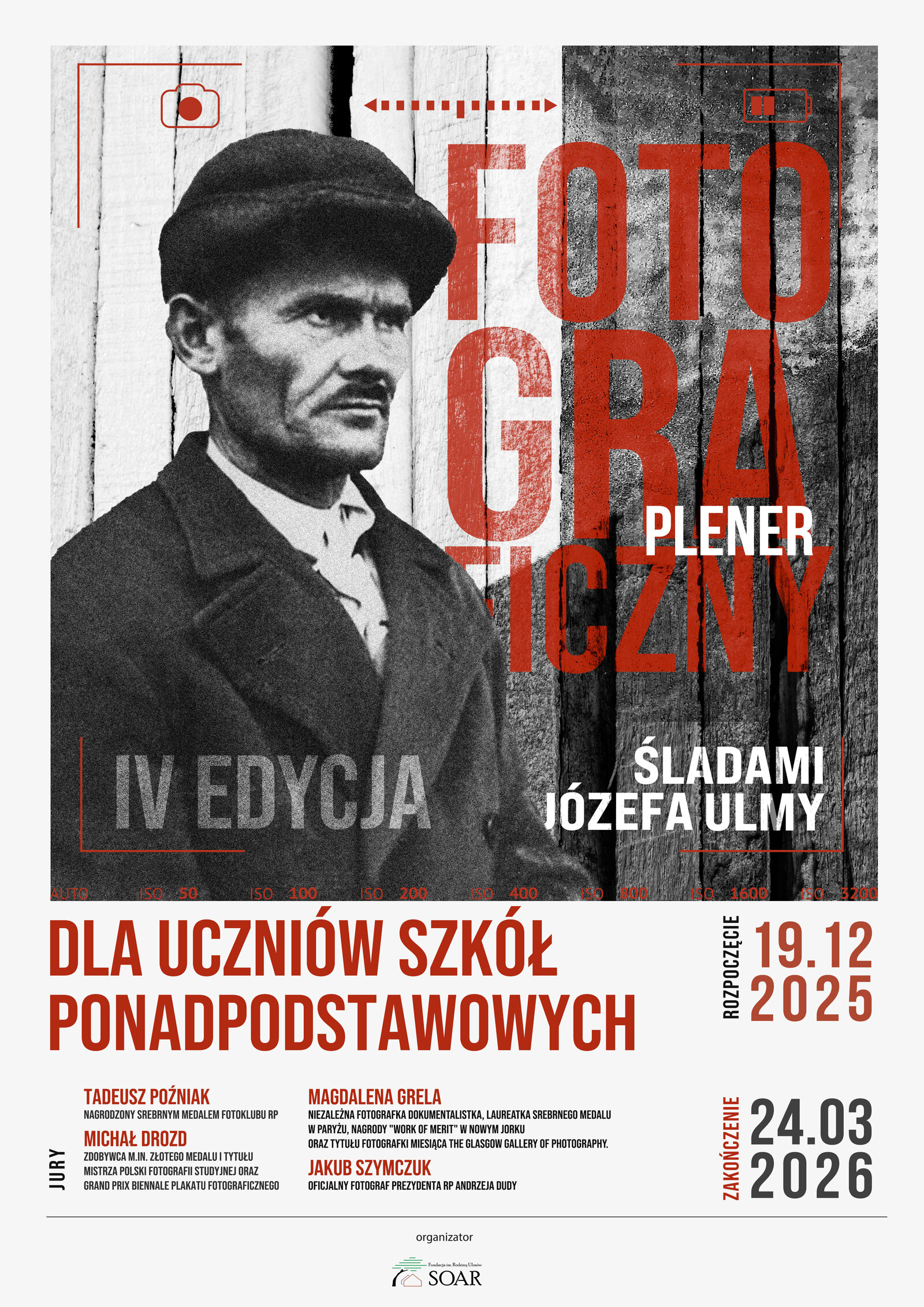 Zapraszamy uczniów szkół ponadpodstawowych do udziału w ogólnopolskim konkursie fotograficznym „Śladami Józefa Ulmy”. Celem konkursu jest nie tylko rozwijanie pasji fotograficznej, ale również upamiętnienie postaci Józefa Ulmy i popularyzacja wartości, które reprezentował. To wyjątkowa okazja, by młodzież mogła spojrzeć na historię poprzez obiektyw aparatu. Prace należy nadesłać do dnia 16 marca 2026 r. Szczegółowe informacje o konkursie można znaleźć w jego w regulaminie. Zobacz plakat promujący konkurs.